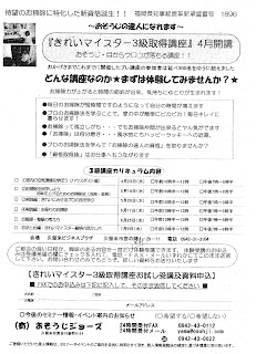 現在、「3級講座」において、興味ある内容を無料で1度だけ体験できますよ(^_-)詳しくは、下記のちらしをご覧下さい。