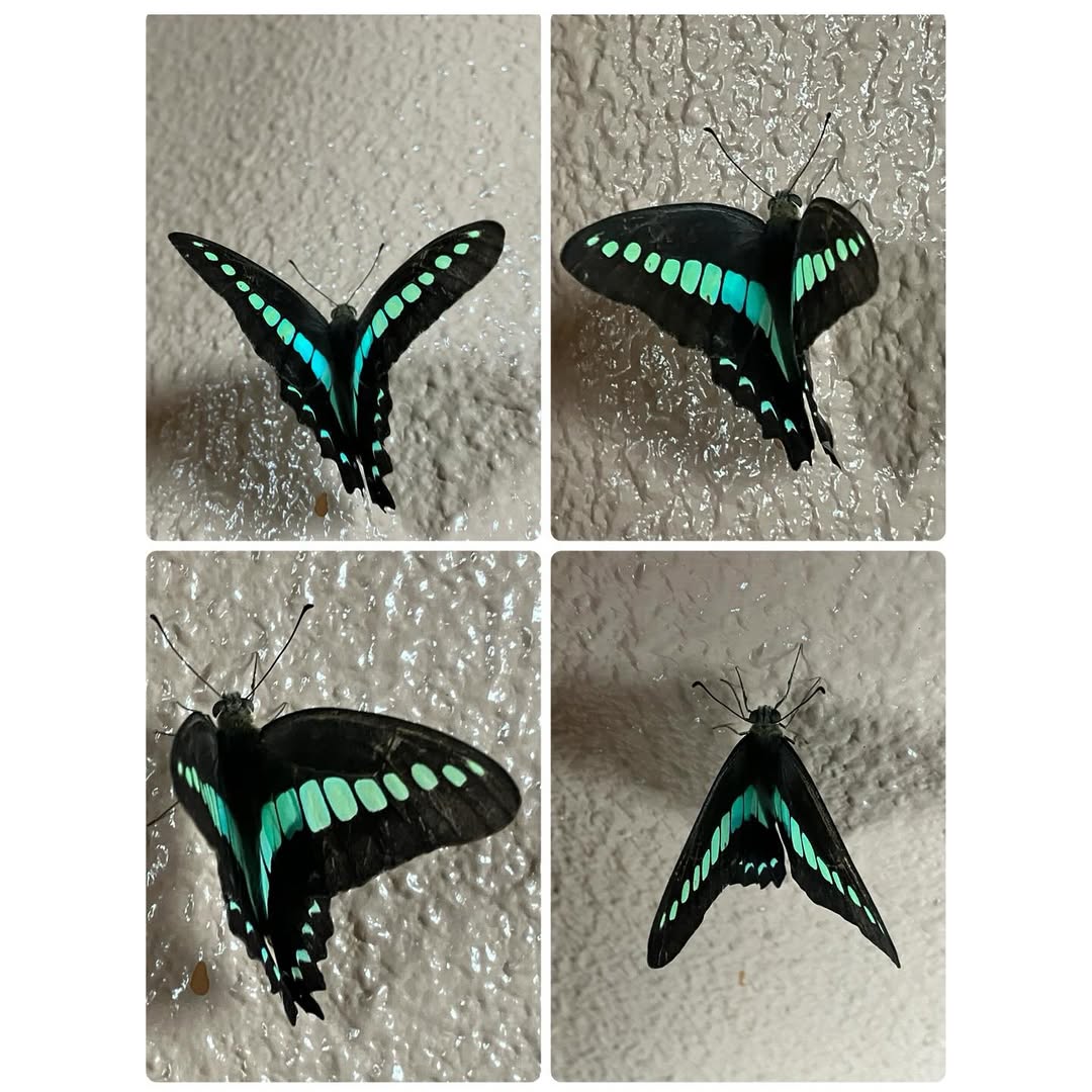 アオスジアゲハの雨宿りと加工 2025.08.17 先般、玄関扉横にて雨やどり中… 近づいても動きません。。 いじらしい❣️ アオスジアゲハノを飛ばしてみた🤗 色々あるけど…Adobe Photoshop iPhoneアプリもイイかも👍