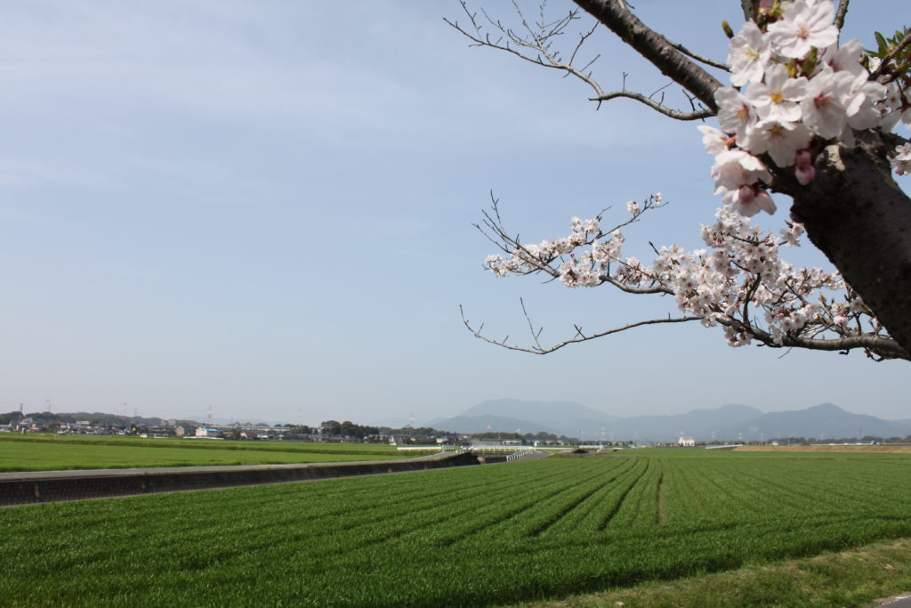 青々とした麦畑と桜